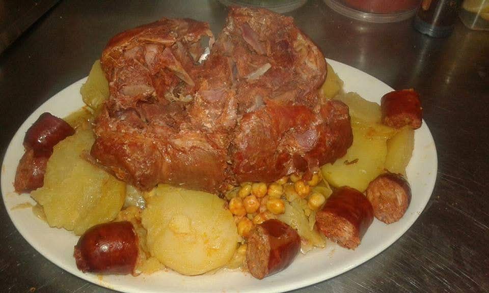 Huevos fritos con patatas, acompañados de jamón, bacon o chorizo.