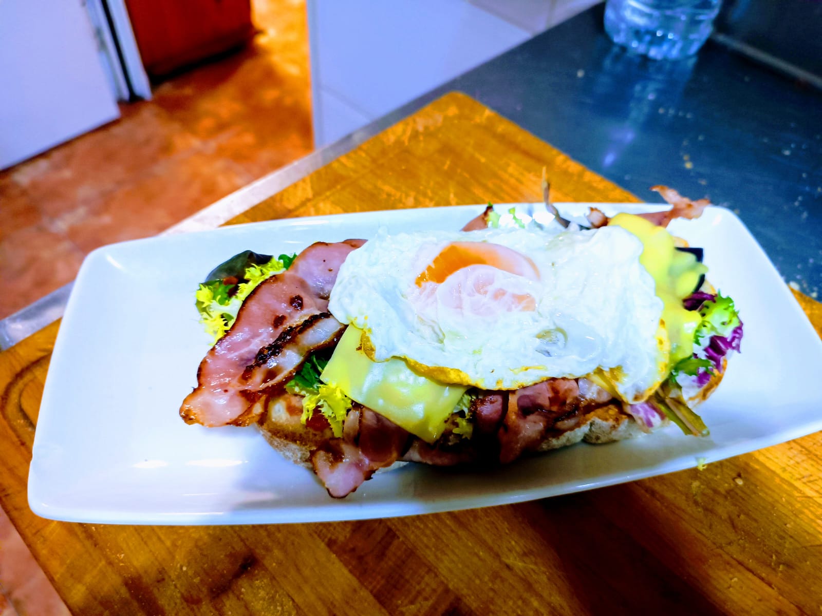 Bacon, lechuga, cebolla confitada, huevo y queso.