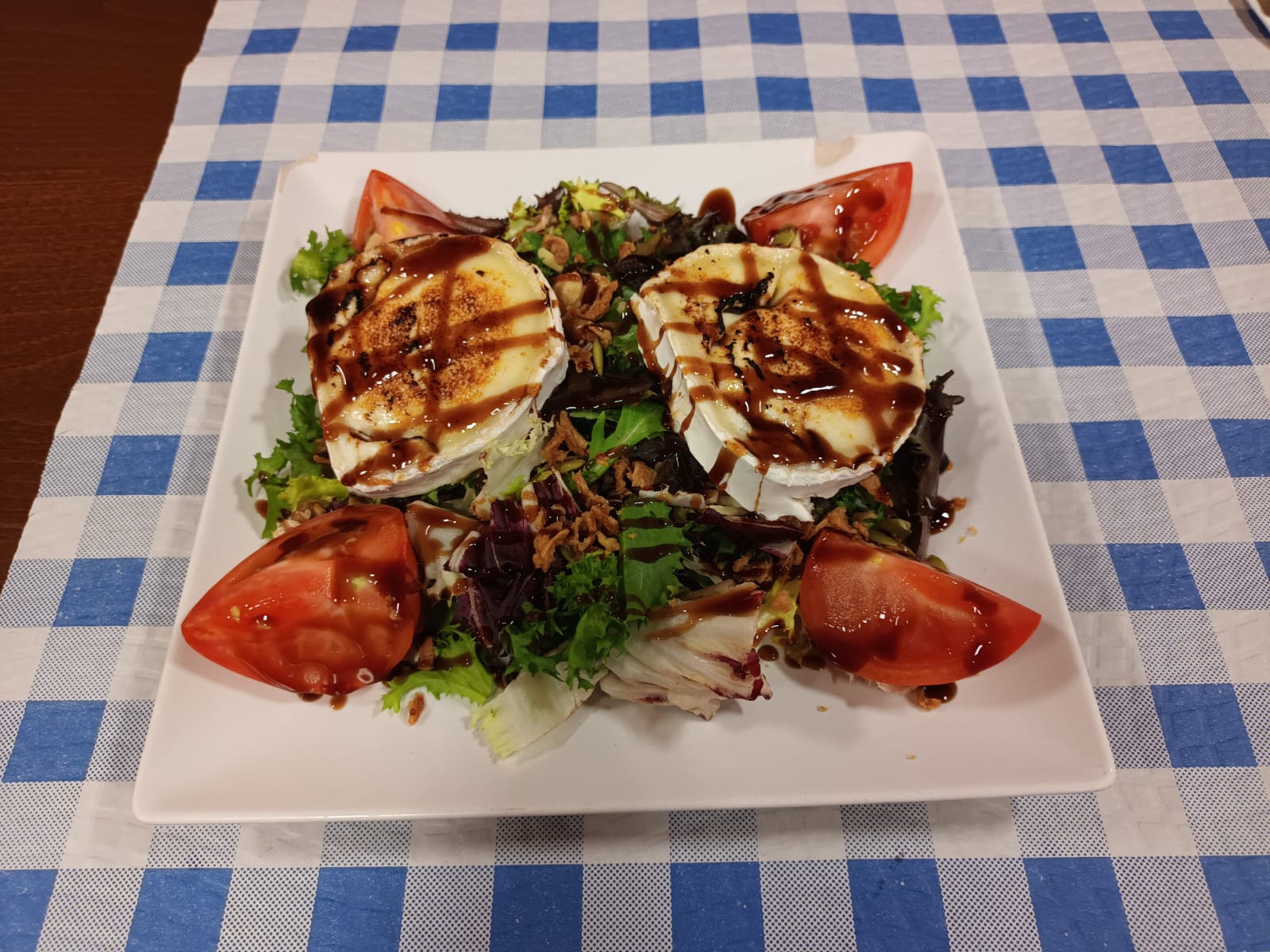 Lechuga, queso de cabra, frutos secos, tomate y aderezo.